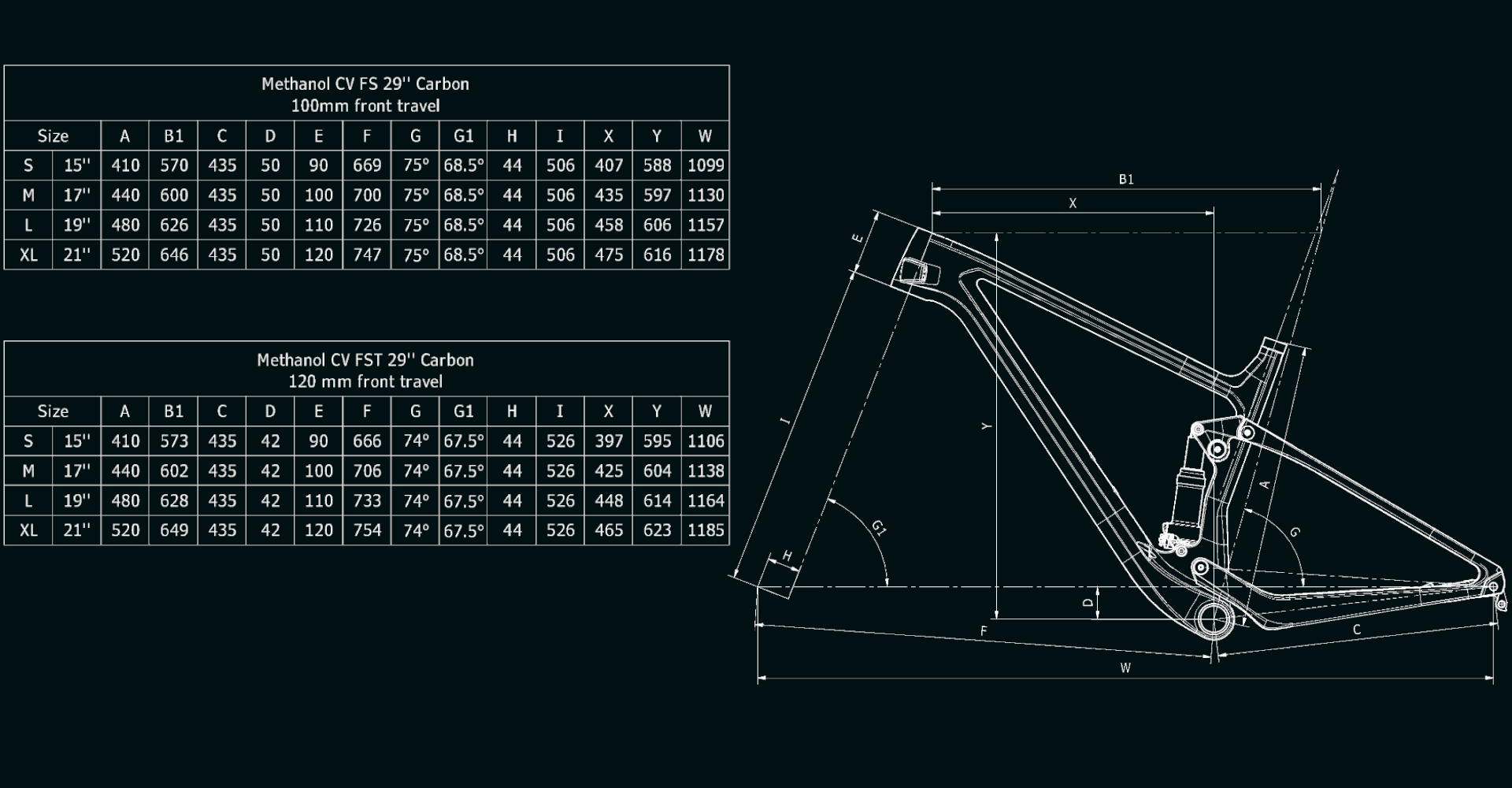 Methanol CV FS 100mm 29" full carbon HM monocoque w/Bianchi CV, 1.5" tapered HT, BB92, only 1x drivetrain, PM 160mm carbon dropout, 12x148mm BOOST, internal cable routing, seatpost diam. 31,6mm, shock lenght/travel 190/40mm w/eyelets 20mm x diam.8mm, size